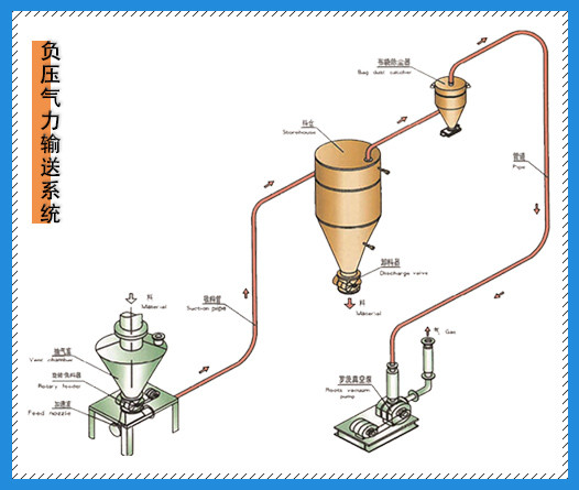 正負(fù)壓稀相輸送,料氣比大約為0~30,為粒體懸浮于氣流中,可根據(jù)正負(fù)壓各自輸送距離與產(chǎn)量來合理選定出動(dòng)力源風(fēng)量與風(fēng)壓,亦可根據(jù)不同工況,組合成不同形式的正負(fù)壓一…